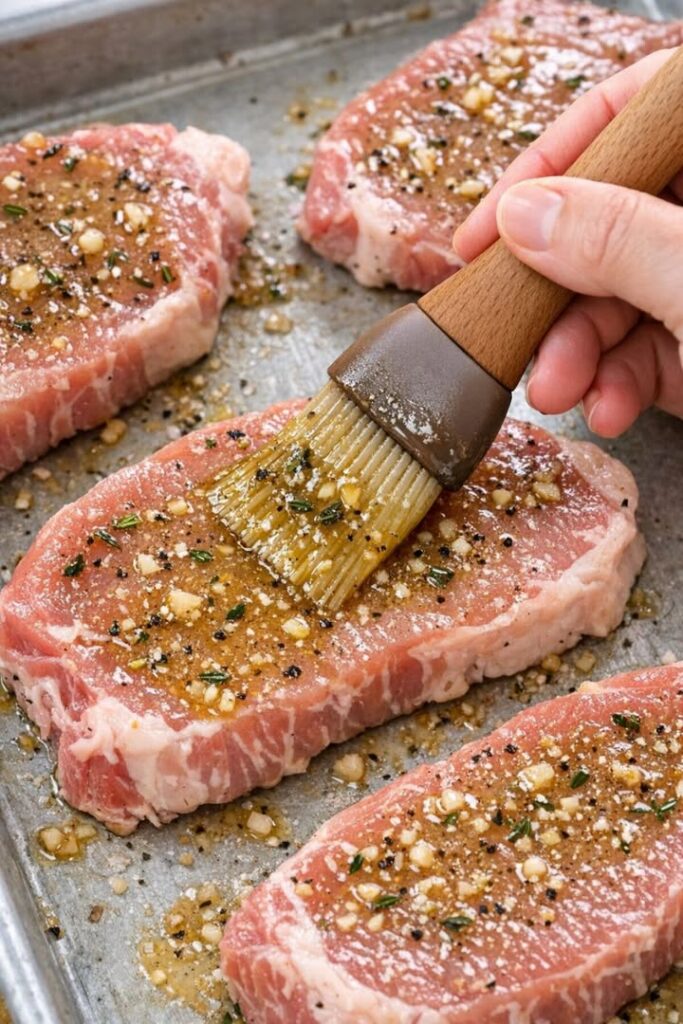 Using a pastry brush or the back of a spoon, brush this 1 glossy coat generously over the tops and sides of the raw pork cutlets right on the baking sheet. Make sure each cutlet is evenly covered so every bite gets that sweet-tangy, garlicky flavor. Scrape any remaining mixture from the bowl onto the cutlets.