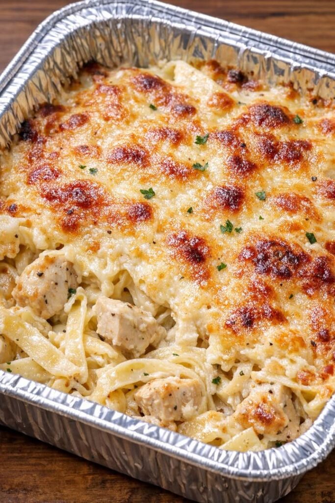 Let the chicken alfredo bake rest for 5–10 minutes before serving so it can set up slightly. Serve straight from the disposable foil pan, and refrigerate any leftovers in airtight containers for easy reheat-and-eat meals.