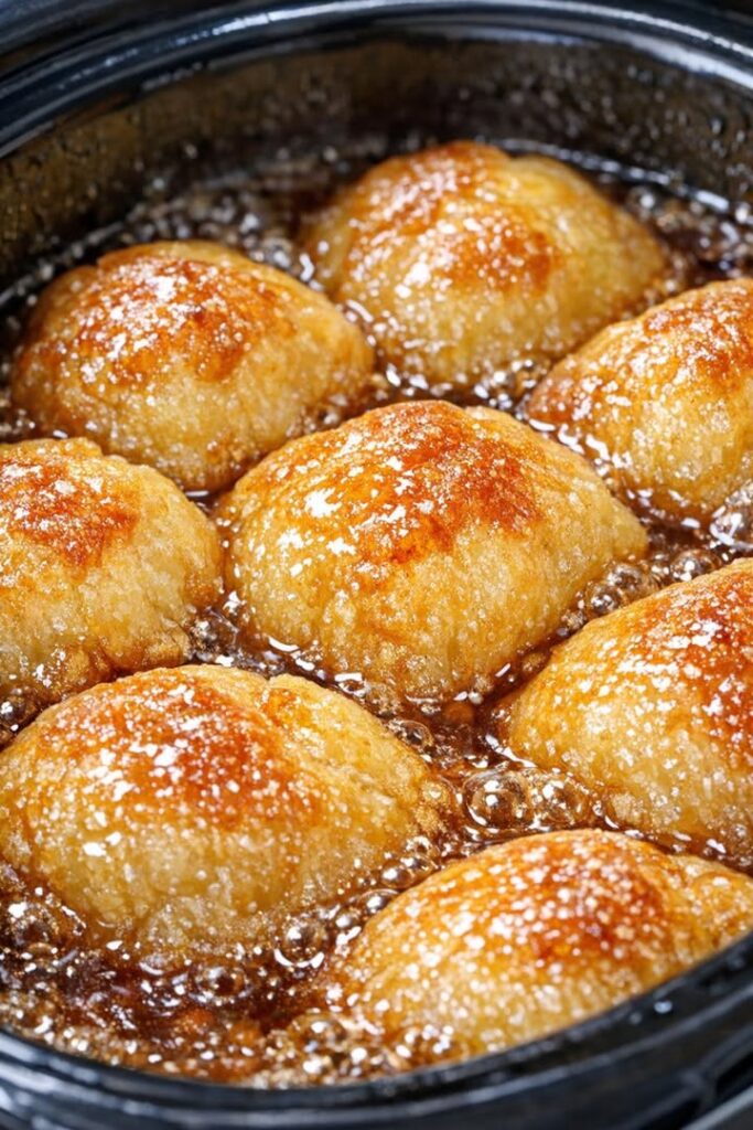 Cook until golden and pillowy: Cover and cook on HIGH for 2 to 2 1/2 hours, or on LOW for 3 1/2 to 4 hours, until the dumplings are puffed, cooked through, and the sauce is thickened and amber-colored. The tops will look soft and glossy, and the dumplings will be surrounded by a rich, bubbling syrup.